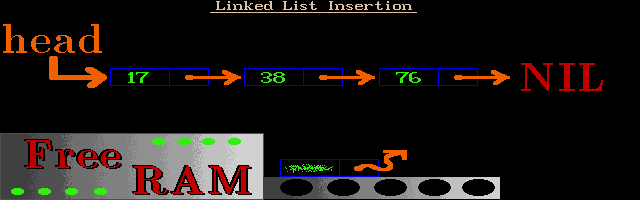 The students watch as the new memory chunk is filled with proper data values, and then inserted into the linked list. The arrows (pointers) are animated so the students can see the order in which pointers are linked and unlinked. The students also see what happens when a programmer is careless with unlinking: part of the list can be lost.